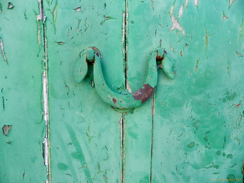 0 Türklopfer aus Alcudia, auf Türensammlerin Türkise Tür in der Altstadt von Alcudia im Norden von Mallorca